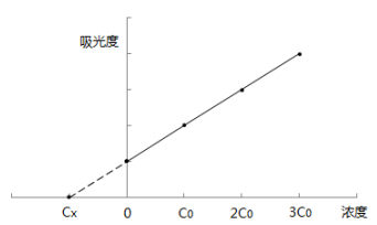 分別量取四份等量待測(cè)試樣(濃度為Cx),配制總體積相同的四份溶液。第一份不加標(biāo)準(zhǔn)溶液,第二、三、四份分別按比例加入不同濃度的標(biāo)準(zhǔn)溶液,四份溶液的濃度分別為:Cx、Cx+Co、Cx+2Co、Cx+3Co;加入標(biāo)準(zhǔn)溶液Co的濃度約等于0.5倍量的試樣濃度,即Co≈0.5Cx。用空白 溶液調(diào)零,在相同條件下依次測(cè)定四份溶液的吸光度。以吸光度為縱坐標(biāo),加入標(biāo)準(zhǔn)溶液的濃度為橫坐標(biāo),繪制校準(zhǔn)曲線,曲線反相延伸與橫坐標(biāo)的交點(diǎn)即為待測(cè)試樣的濃度。待測(cè)試樣濃度與對(duì)應(yīng)吸光度的關(guān)系見圖A.1。