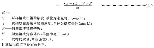 試樣中總鉛含量以鉛元素的質量分數ω計,數值以毫克每千克(mg/kg)表示,按式(1)計算