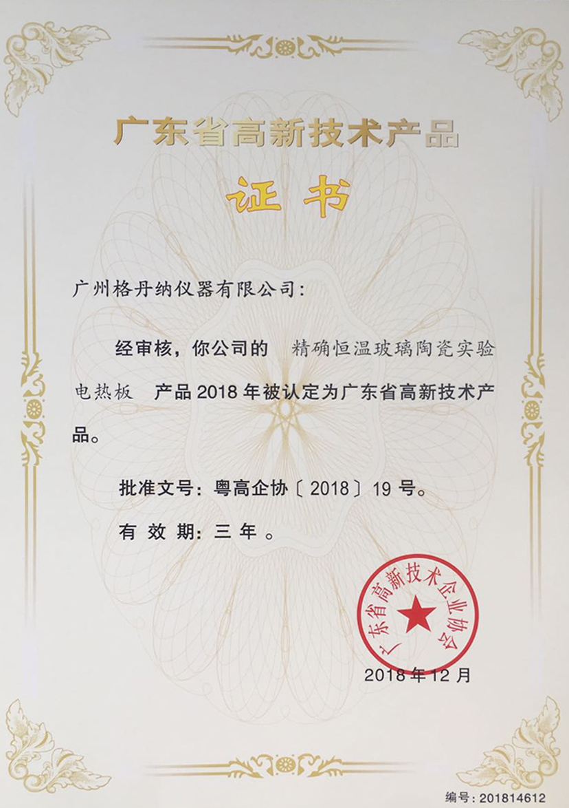 獲得《《廣東省高新技術產品》稱號-精確恒溫玻璃陶瓷實驗電熱板》