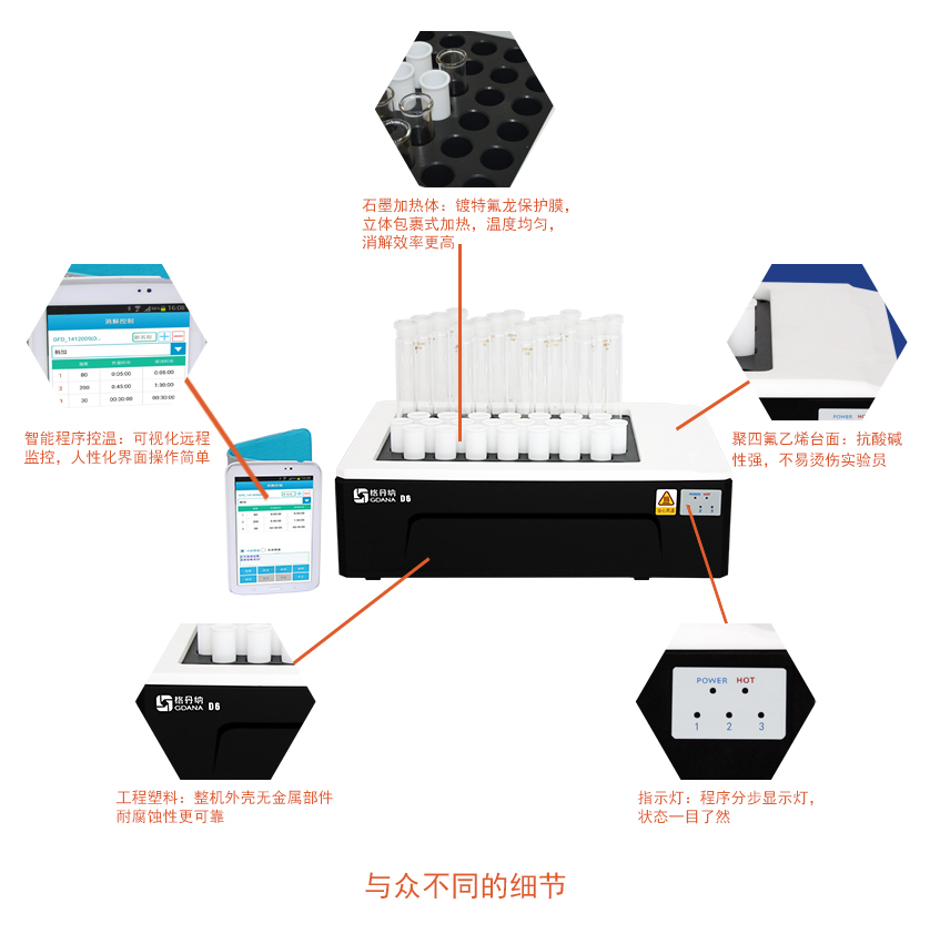 D6智能石墨消解儀采用高純石墨材料作為加熱體,包裹式加熱,效率更高,溫度均勻性更好。多孔設(shè)計(jì),輕松實(shí)現(xiàn)樣品的批量處理,D6石墨消解儀是您樣品消解的好伴侶。