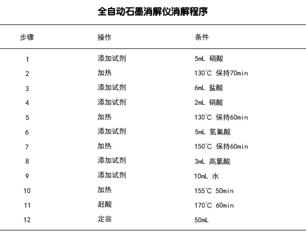 準(zhǔn)確稱取0.50g樣品,放置聚四氟乙烯消解管中,然后插入全自動石墨消解儀石墨孔中,加入5mL硝酸,加熱到130℃,維持70min;加入6mL鹽酸、2mL硝酸,130℃加熱60min;加入5mL氫氟酸,加熱到150℃,維持60min,加入3mL高氯酸、10mL純水,加熱到155℃,維持50min,后趕酸,并自動定容至50mL,搖勻待測。(具體全自動消解儀消解程序見下面表格)。同時進(jìn)行試劑空白試驗。